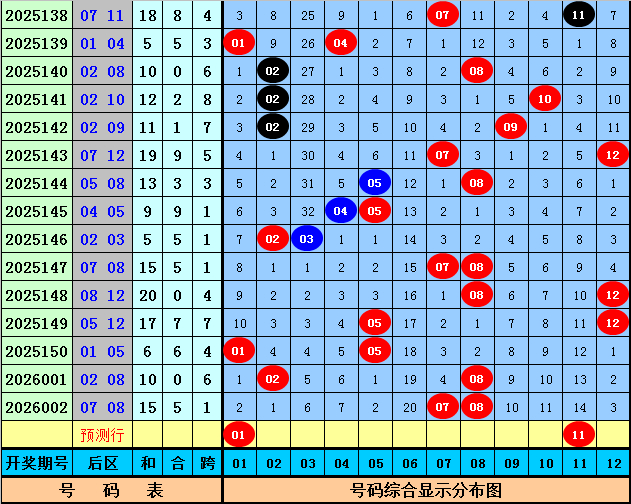 后区上期开出奖号07和08,该组合历史上出现了42次,其下期奖号频次分别为:号码07出现11次,03出现10次,10出现9次,09出现8次,08出现7次,01、04、05、12出现6次,11出现5次,02、06出现4次,本期后区参考号码01、07、08、11,精选两码01和11。