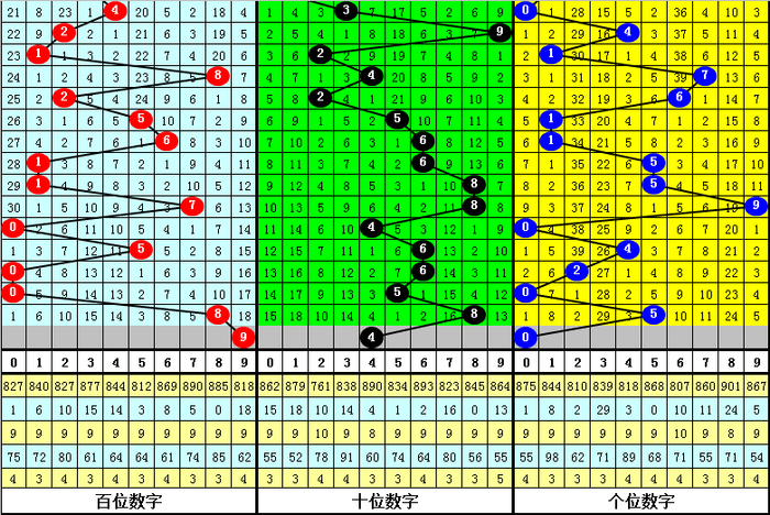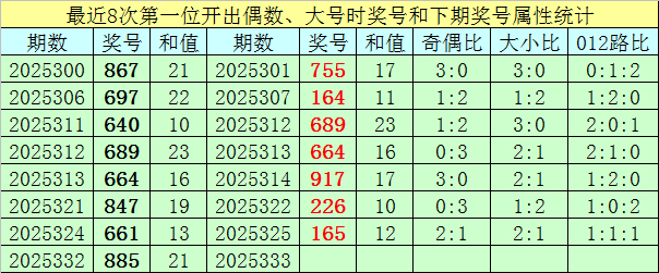 前7次第一位号码开出偶数、大号时奖号分别为:867、697、640、689、664、847、661,其中奇偶总比例为6:15,有4期奇偶比与上期奇偶比相同;号码大小总比例为16:5,有3期奖号大小比与上期大小比相同;