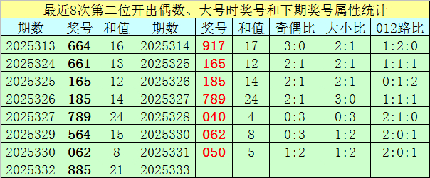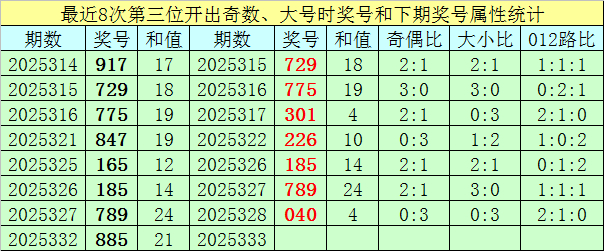 上期回顾:福彩3D第2025332期开出奖号为885,奖号奇偶比为1:2,大小比为3:0,012路比0:0:3。