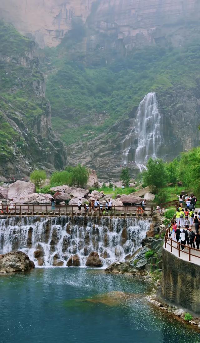 宝泉景区的标志性景点,有“中原第一瀑”之美誉,景色很绝!完全超乎我的想象,瀑布落差高达320米,气势恢宏,流速飞快,整条瀑布从断崖倾泻而下,很震撼!水幕景观甚好,我连连叫好!瀑布之下是碧绿如玉的潭水,四周是丹崖赤壁,景色格外好看!适合拍照!