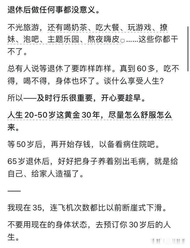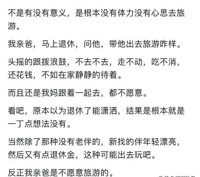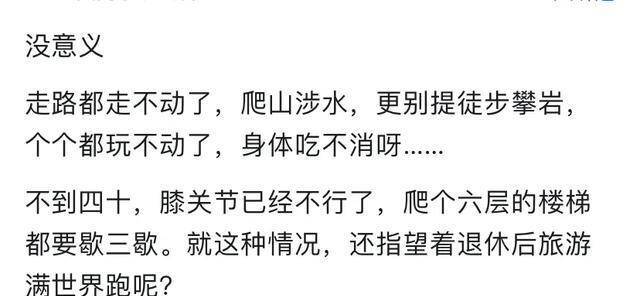 自己欢喜就有意义,到了五六十岁了自己不欢喜再有意义也没啥意义~比如我,如果让我继续有份让我充实又没多少闹心的工作,我觉得比让我去旅游更有意义。