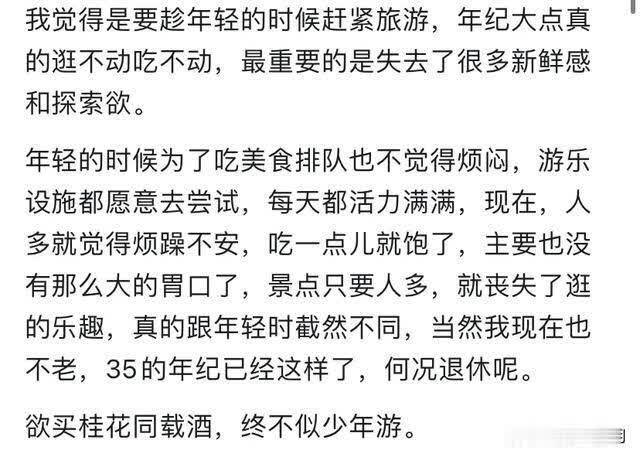 退休旅游有意义,但心境已变。“欲买桂花同载酒,终不似少年游”道尽岁月怅然。少年游是激情探索,退休游则是追忆释怀。风景依旧,不再是向外猎奇,而是与时光和解,接纳老去。