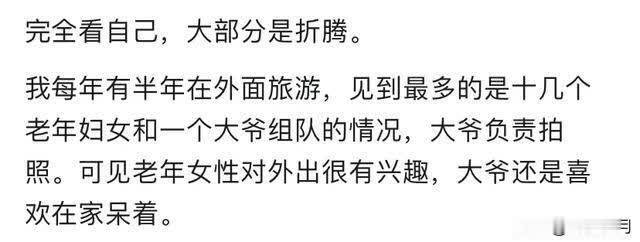 大爷们一般年轻时到处跑,该看的看了,该玩的玩了,该享受的也享受了,年纪一大也玩不动就可能只想呆在家里了;而大妈们年轻时被家务和一家老小困在家里,老人走了,孩子成家立业了才有时间出去,估计原因大抵是这样